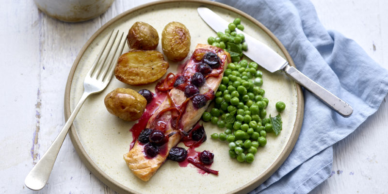 An easy but impressive dinner dish. The blueberries create a soft and tangy sauce which caramelises on top of the salmon.